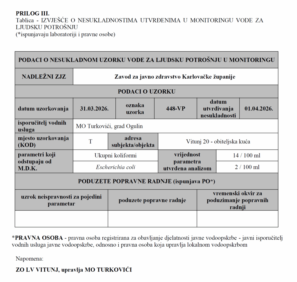 Izvješće o nesukladnostima utvrđenima u monitoringu vode za ljudsku potrošnju – MO Turkovići, Grad Ogulin, Vitunj 20 – obiteljska kuća
